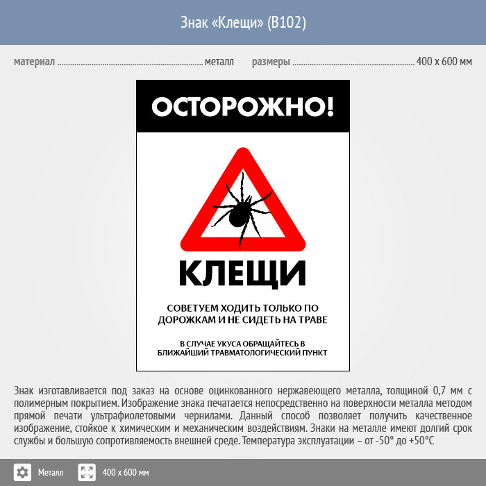 Знак «Осторожно! Клещи», B102 (металл, 300х400 мм) в Химках купить