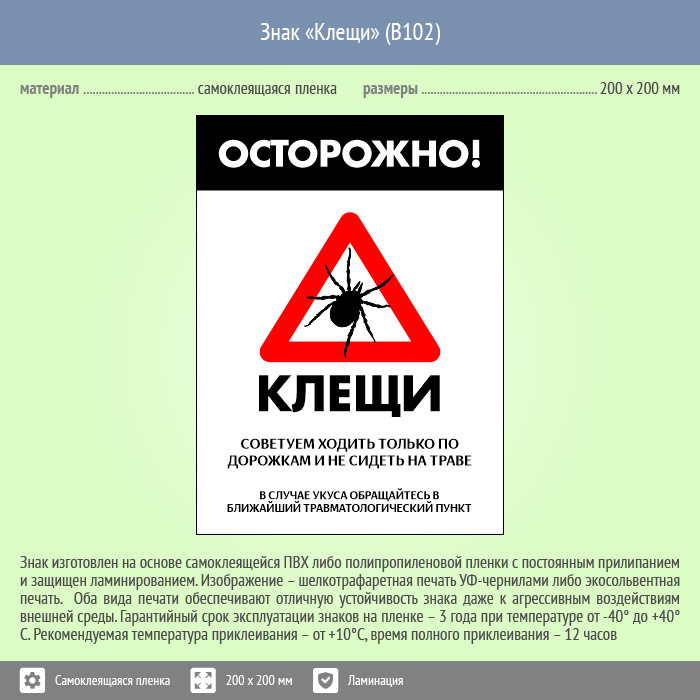 Знак «Осторожно! Клещи», B102 (пленка c ламинированием, 400х600 мм) в Химках купить