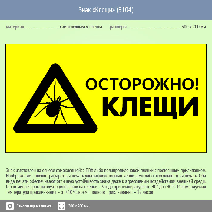Знак «Осторожно! Клещи», B104 (пленка, 400х300 мм) в Химках купить