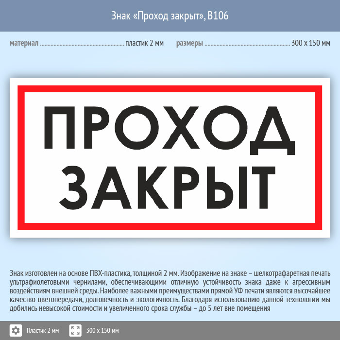 Знак «Проход закрыт», B106 (пластик, 300х150 мм) в Химках купить