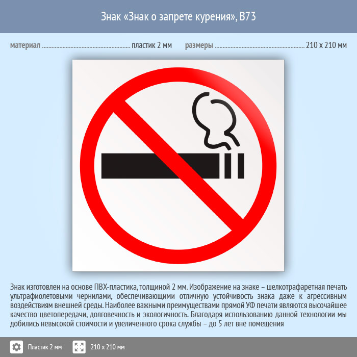 Знак «Знак о запрете курения», B73 (пластик, 210х210 мм) в Химках купить