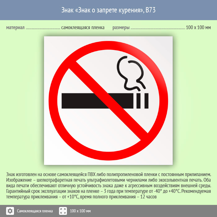 Знак «Знак о запрете курения», B73 (пленка, 100х100 мм) в Химках купить