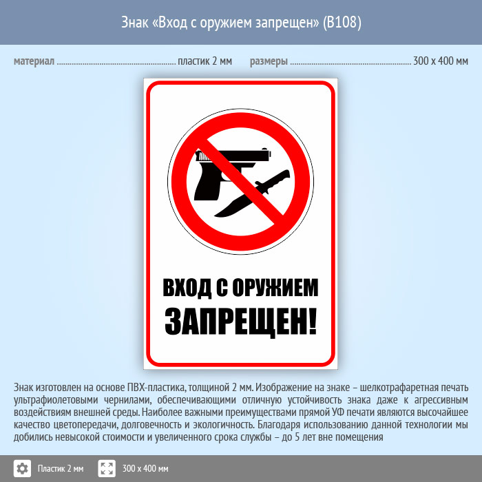 Знак «Вход с оружием запрещен», B108 (пластик, 300х400 мм) в Химках купить