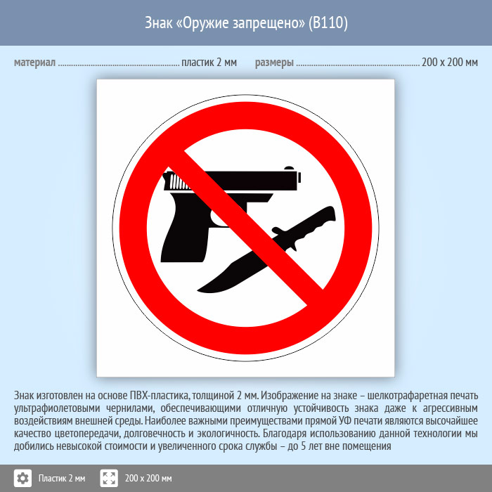 Знак «Оружие запрещено», B110 (пластик, 200х200 мм) в Химках купить