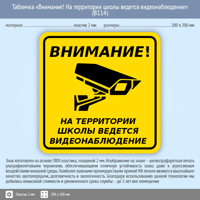 Табличка «Внимание! На территории школы ведется видеонаблюдение», B114 (пластик, 200х200 мм) в Химках купить