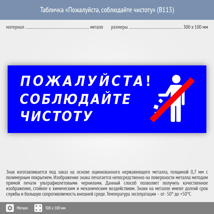 Табличка «Пожалуйста, соблюдайте чистоту», B113 (металл, 300х100 мм) в Химках купить