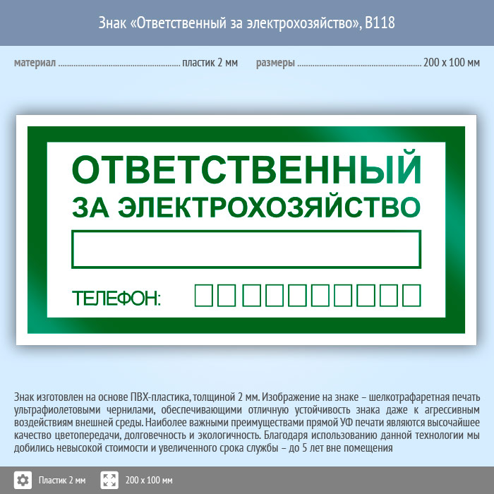 Знак «Ответственный за электрохозяйство», B118 (пластик, 200х100 мм) в Химках купить
