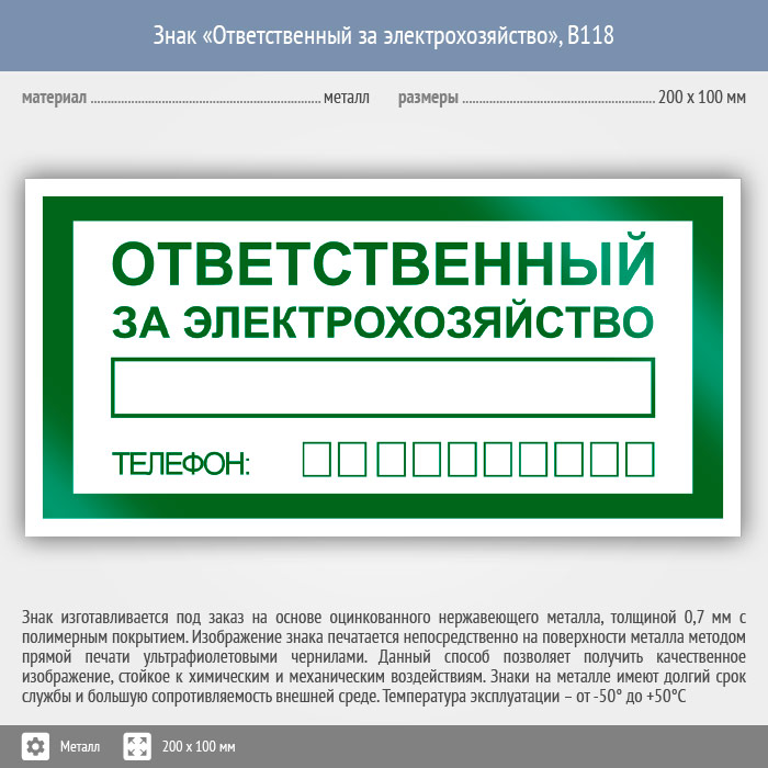 Знак «Ответственный за электрохозяйство», B118 (металл, 200х100 мм) в Химках купить