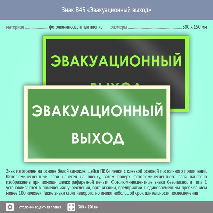 Знак B43 «Эвакуационный выход» (фотолюминесцентная пленка, 300х150 мм) в Химках купить