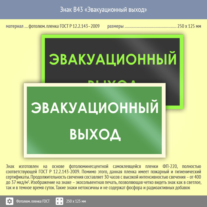 Знак B43 «Эвакуационный выход» (фотолюминесцентная пленка ГОСТ 34428-2018, 250х125 мм) в Химках купить