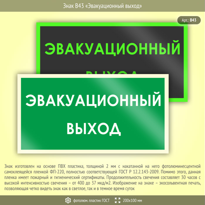 Знак B43 «Эвакуационный выход» (фотолюминесцентный пластик ГОСТ 34428-2018, 200х100 мм) в Химках купить