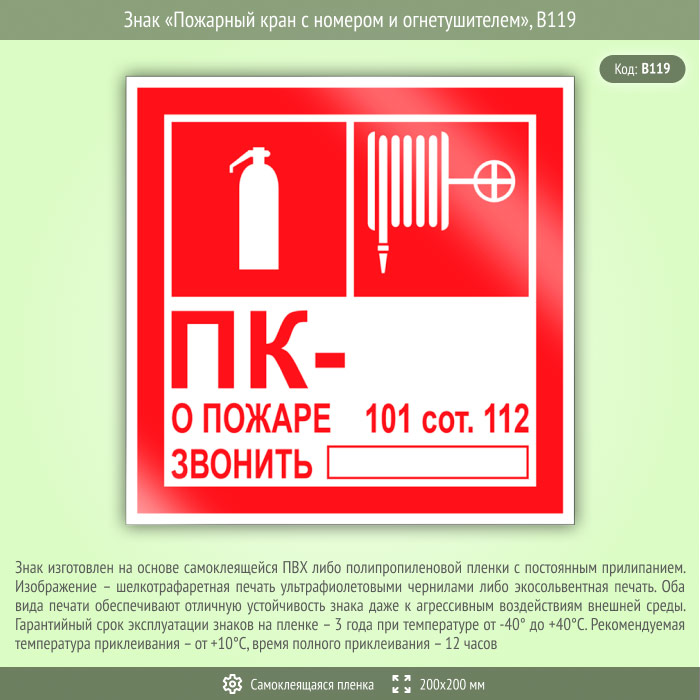 Знак «Пожарный кран с номером и огнетушителем», B119 (пленка, 200х200 мм) в Химках купить