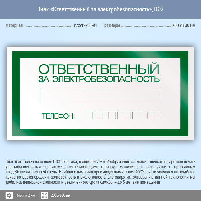 Знак «Ответственный за электробезопасность», B02 (пластик, 200х100 мм) в Химках купить