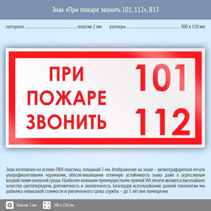 Знак «При пожаре звонить 101, 112», B13 (пластик, 300х150 мм) в Химках купить
