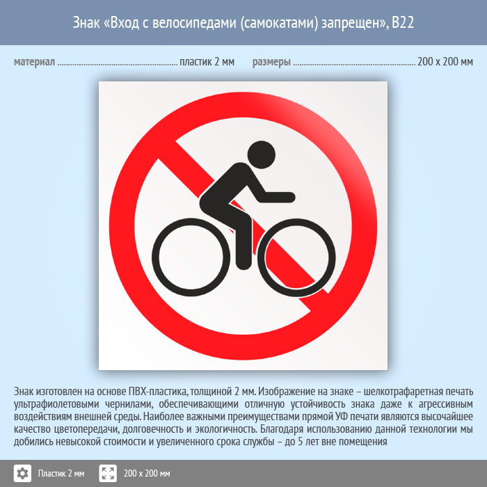 Знак «Вход с велосипедами (самокатами) запрещен», B22 (пластик, 200х200 мм) в Химках купить