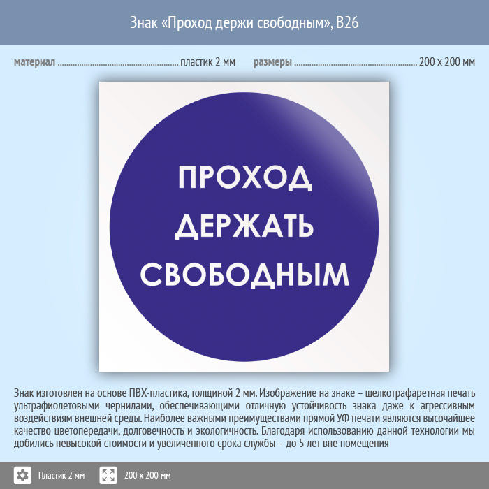 Знак «Проход держи свободным», B26 (пластик, 200х200 мм) в Химках купить