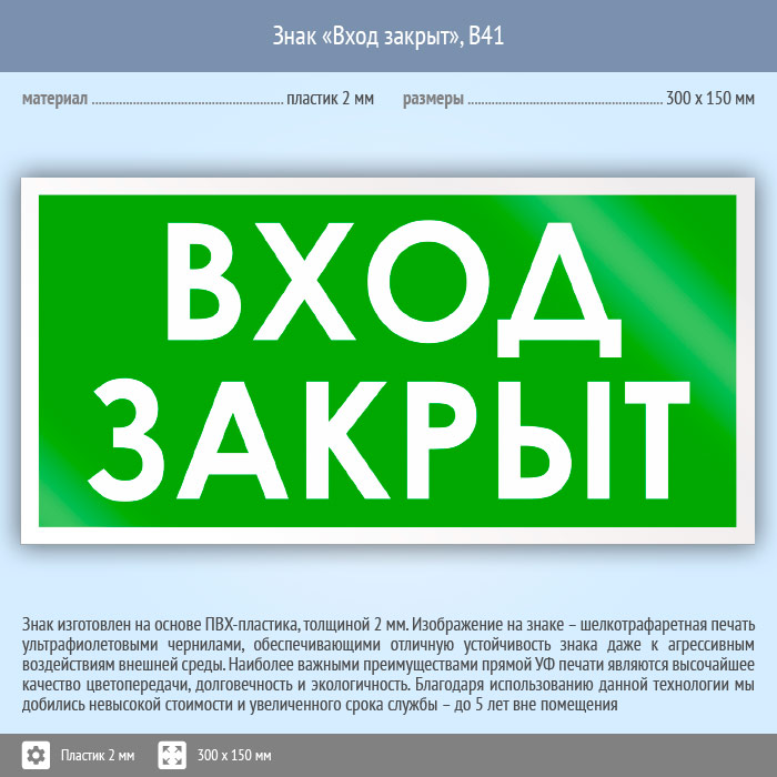 Знак «Вход закрыт», B41 (пластик, 300х150 мм) в Химках купить