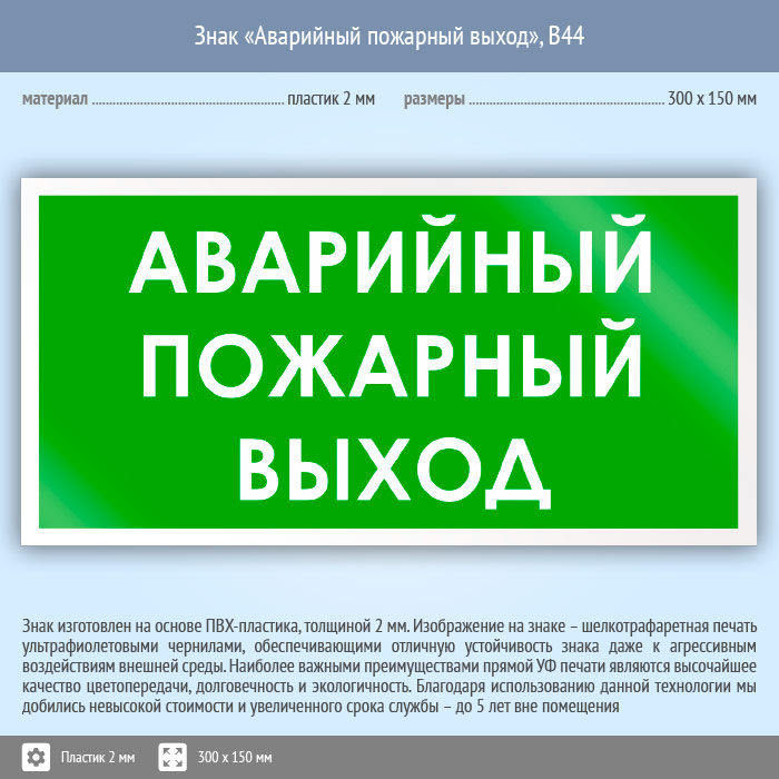 Знак «Аварийный пожарный выход», B44 (пластик, 300х150 мм) в Химках купить