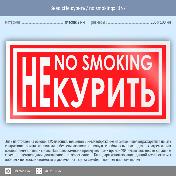 Знак «Не курить / no smoking», B52 (пластик, 200х100 мм) в Химках купить