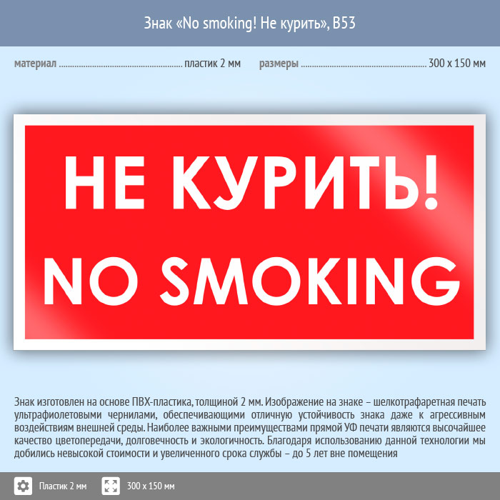 Знак «No smoking! Не курить», B53 (пластик, 300х150 мм) в Химках купить