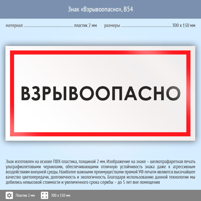 Знак «Взрывоопасно», B54 (пластик, 300х150 мм) в Химках купить