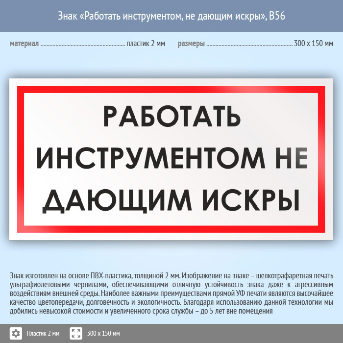 Знак «Работать инструментом, не дающим искры», B56 (пластик, 300х150 мм) в Химках купить