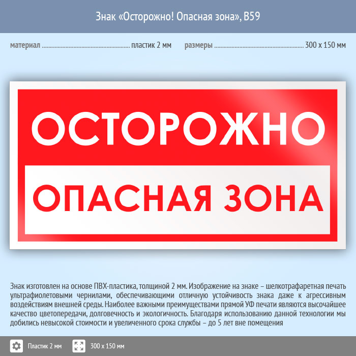 Знак «Осторожно! Опасная зона», B59 (пластик, 300х150 мм) в Химках купить