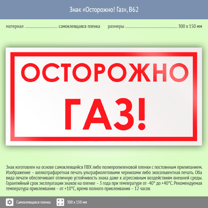 Знак «Осторожно! Газ», B62 (пленка, 300х150 мм) в Химках купить