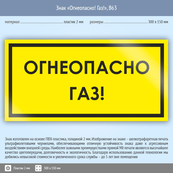 Знак «Огнеопасно! Газ!», B63 (пластик, 300х150 мм) в Химках купить