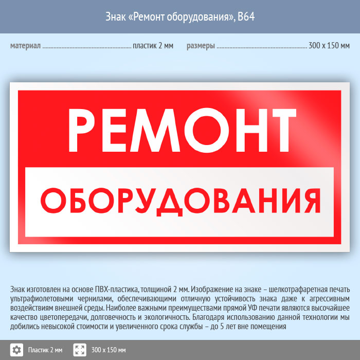 Знак «Ремонт оборудования», B64 (пластик, 300х150 мм) в Химках купить