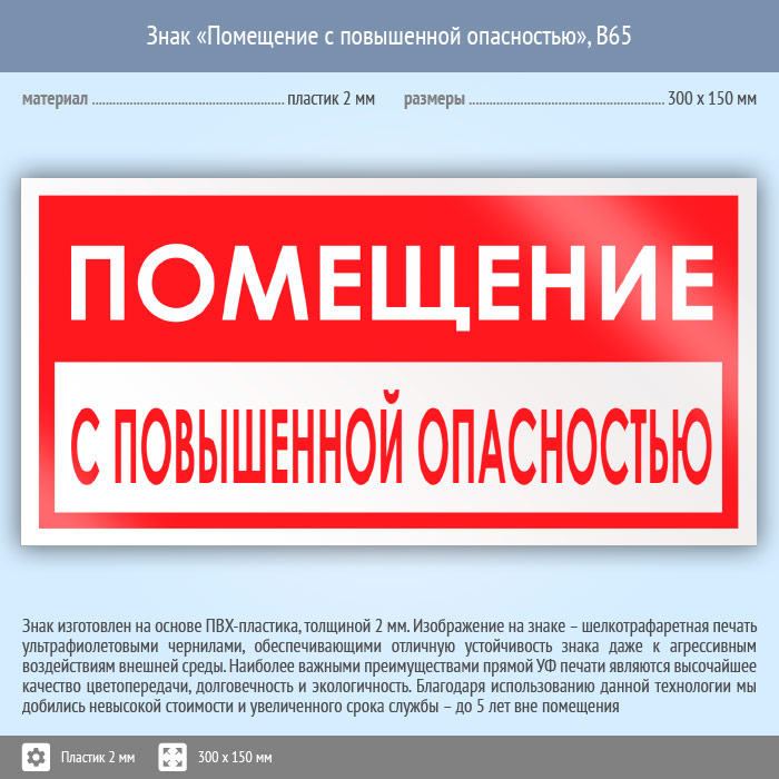 Знак «Помещение с повышенной опасностью», B65 (пластик, 300х150 мм) в Химках купить