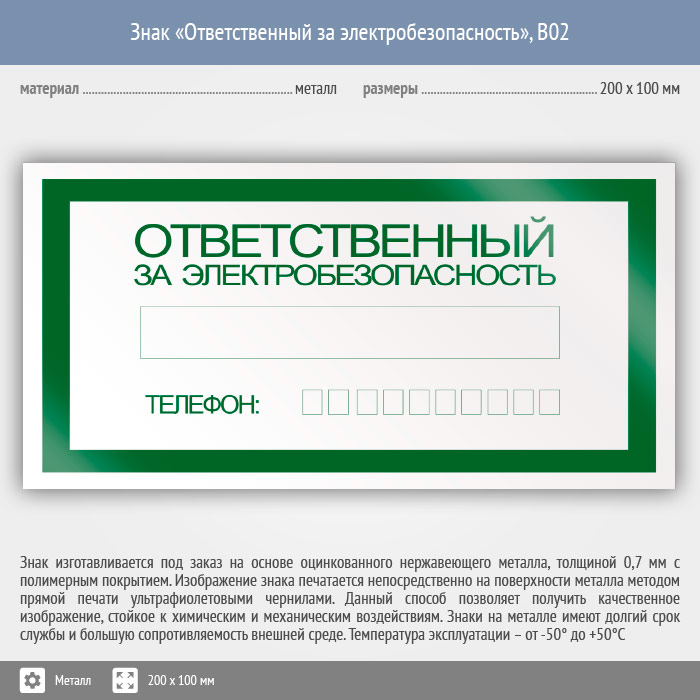 Знак «Ответственный за электробезопасность», B02 (металл, 200х100 мм) в Химках купить