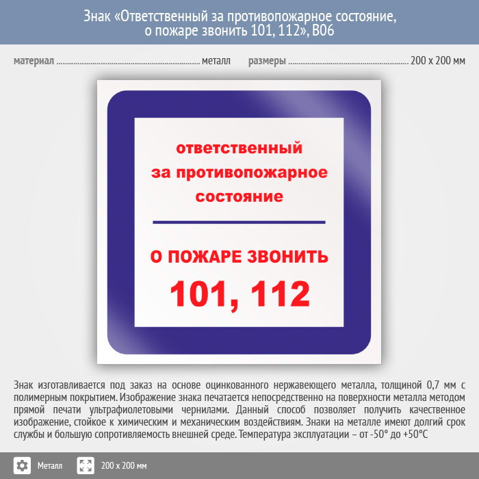 Знак «Ответственный за противопожарное состояние, о пожаре звонить 101, 112», B06 (металл, 200х200 мм) в Химках купить