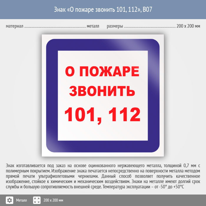 Знак «О пожаре звонить 101, 112», B07 (металл, 200х200 мм) в Химках купить
