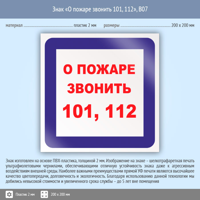 Знак «О пожаре звонить 101, 112», B07 (пластик, 200х200 мм) в Химках купить