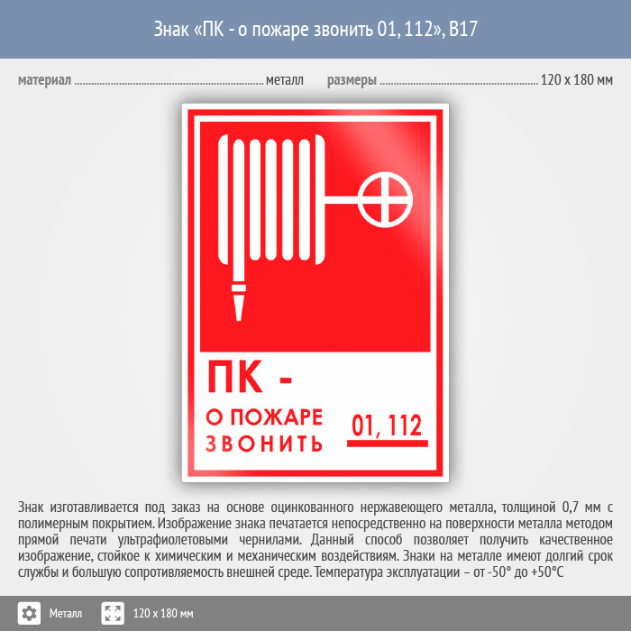 Знак «ПК - о пожаре звонить 01, 112», B17 (металл, 120х180 мм) в Химках купить