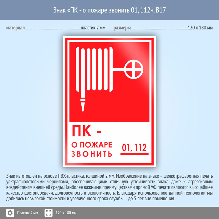 Знак «ПК - о пожаре звонить 01, 112», B17 (пластик, 120х180 мм) в Химках купить