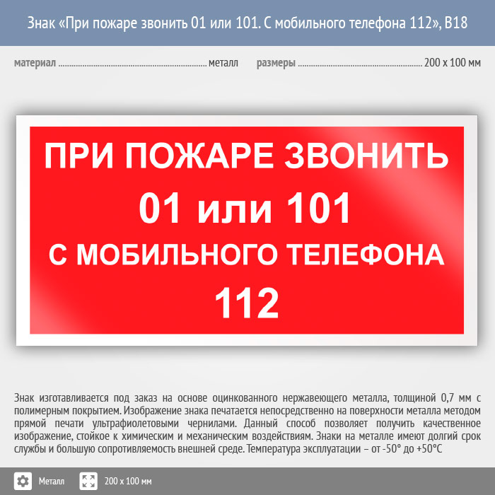 Знак «При пожаре звонить 01 или 101. С мобильного телефона 112», B18 (металл, 200х100 мм) в Химках купить