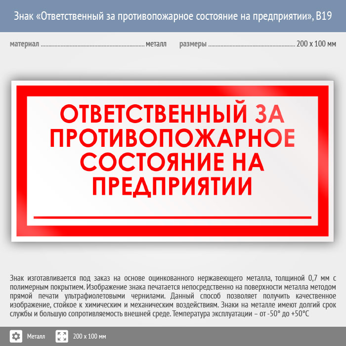 Знак «Ответственный за противопожарное состояние на предприятии», B19 (металл, 200х100 мм) в Химках купить