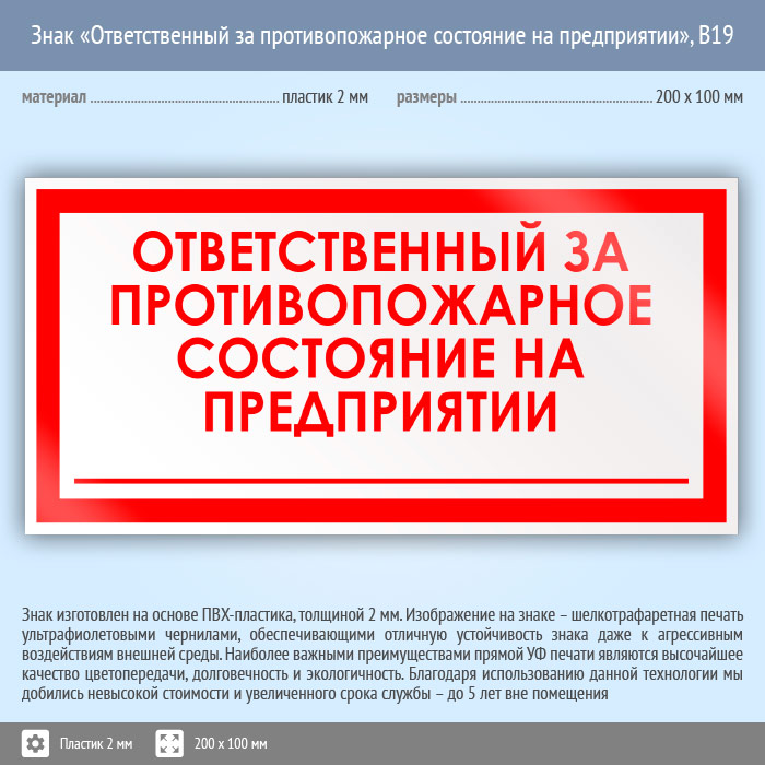 Знак «Ответственный за противопожарное состояние на предприятии», B19 (пластик, 200х100 мм) в Химках купить