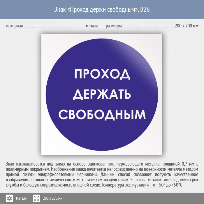 Знак «Проход держи свободным», B26 (металл, 200х200 мм) в Химках купить
