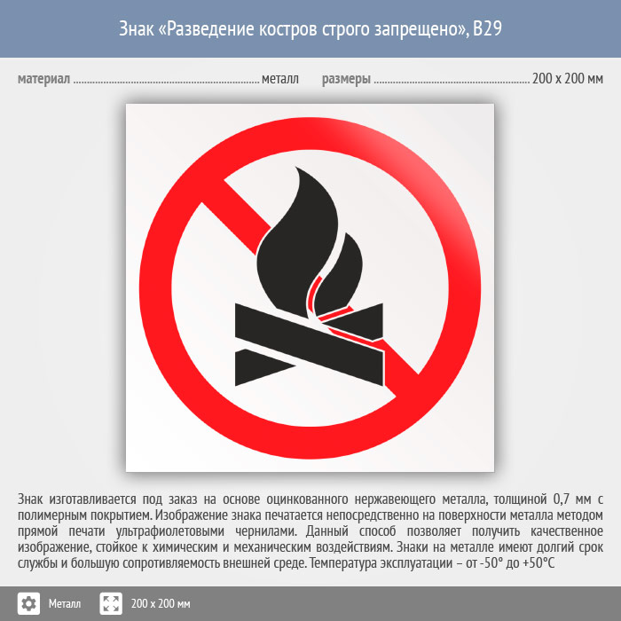 Знак «Разведение костров строго запрещено», B29 (металл, 200х200 мм) в Химках купить