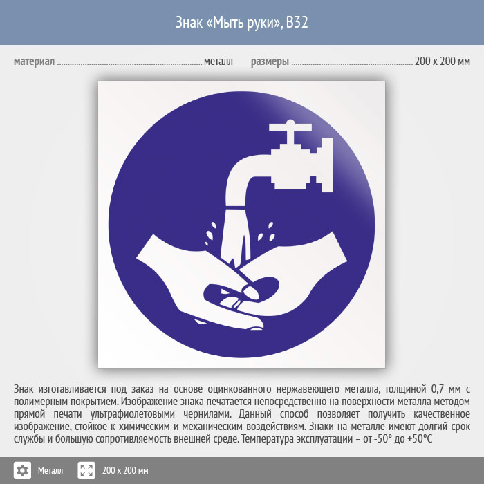 Знак «Мыть руки», B32 (металл, 200х200 мм) в Химках купить