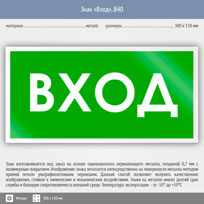 Знак «Вход», B40 (металл, 300х150 мм) в Химках купить