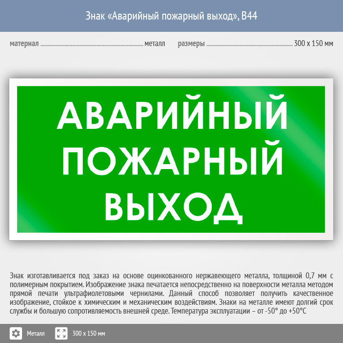 Знак «Аварийный пожарный выход», B44 (металл, 300х150 мм) в Химках купить