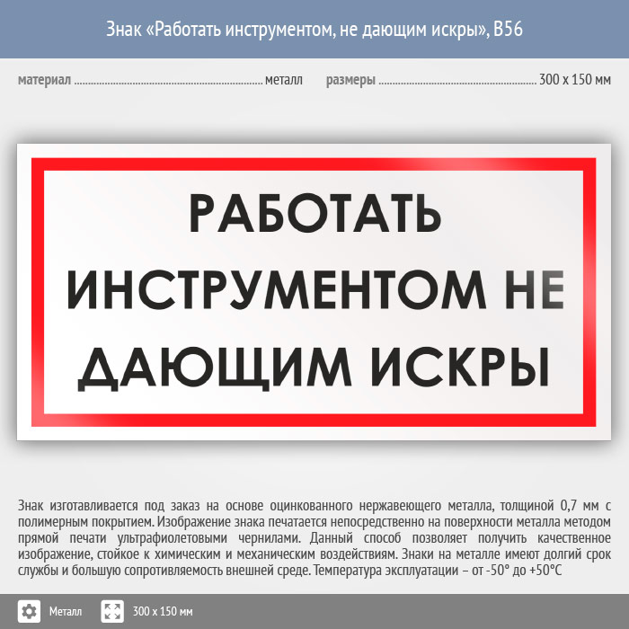 Знак «Работать инструментом, не дающим искры», B56 (металл, 300х150 мм) в Химках купить