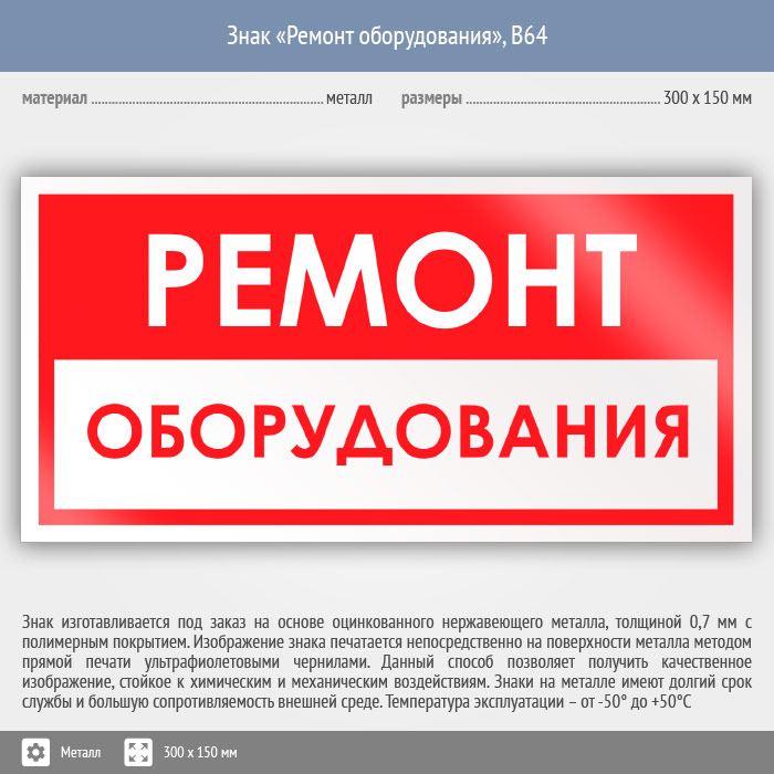 Знак «Ремонт оборудования», B64 (металл, 300х150 мм) в Химках купить