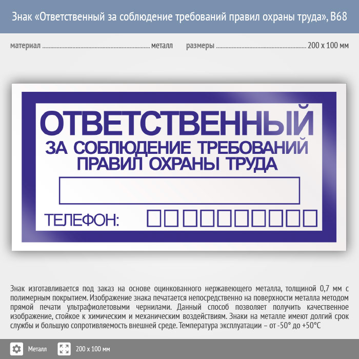 Знак «Ответственный за соблюдение требований правил охраны труда», B68 (металл, 200х100 мм) в Химках купить