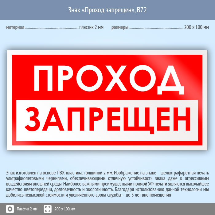 Знак «Проход запрещен», B72 (пластик, 200х100 мм) в Химках купить