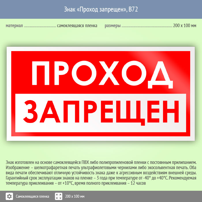 Знак «Проход запрещен», B72 (пленка, 200х100 мм) в Химках купить